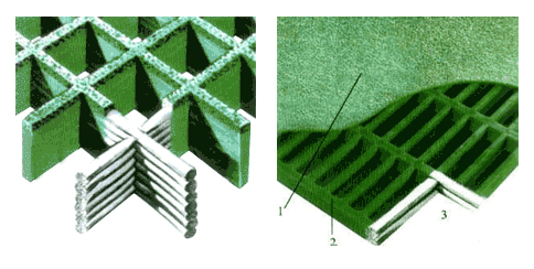 Continuous fiberglass roving is placed in the open, heated mold in alternating layers, wetted out thoroughly with resin. Such a process produce an integral, one- piece construction, which offers excellent corrosion resistance and bi-directional strength as well.
